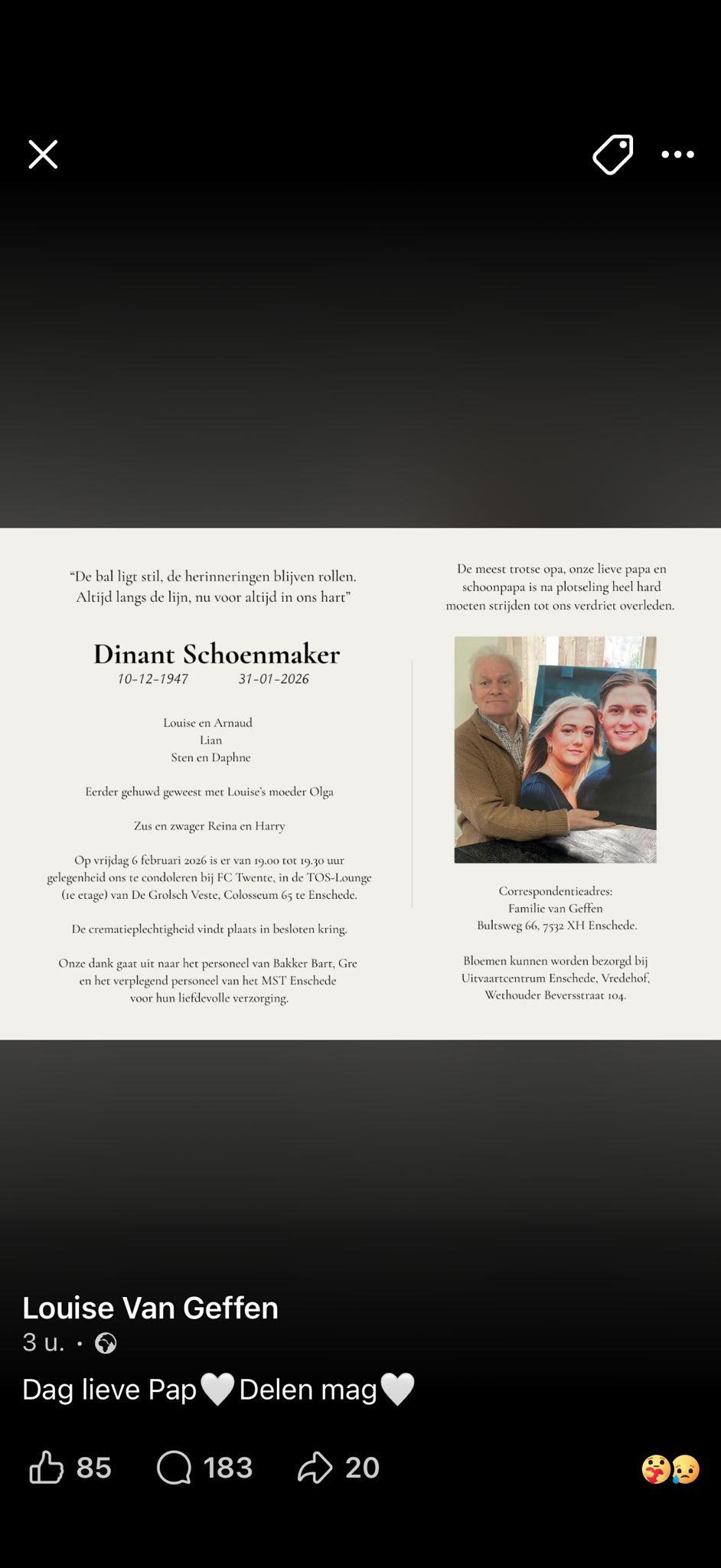 Dinant is 78 jaar oud geworden, wij condoleren de familie met dit verlies en wensen hen veel sterkte voor de toekomst.